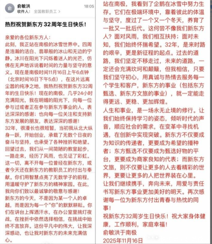 还得是俞敏洪,回应社交平台的质疑都与众不同。新东岁生日,俞敏洪在南极发来祝福,不过处处洋溢着打鸡血的味道,这引起了网友们和公司员工的不满,有疑似公司员工的人员在社交媒体发文,自己正在加班,而老板在南极追寻自我。