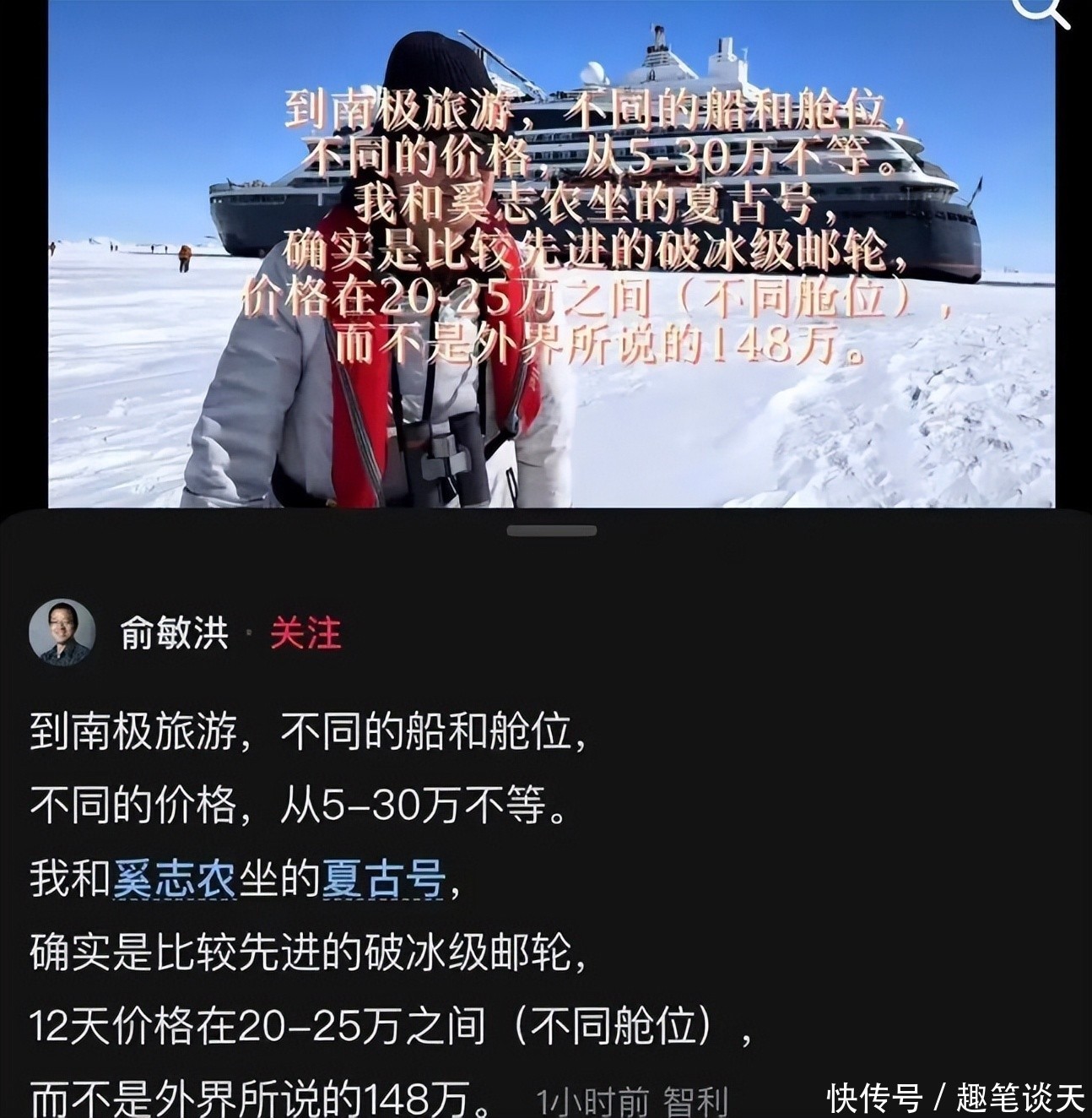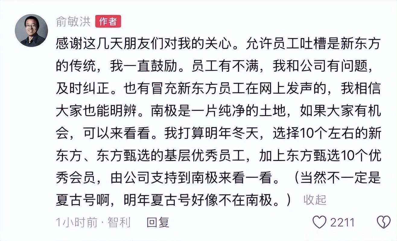 在大多数人看来,俞敏洪情商应该是蛮高的,但是这次不知道怎么就降智了。他��日,在自己的社交媒体上回应称:自己没�万到南极,举例了各种仓位的价格,他说自己和奚志农坐的夏古号,12天价格�万—25万之间,不是网上说�万。还说允许员工吐槽是公司的传统,让大家擦亮眼,也有冒充新东方员工在网上发声的。同时说明年会�个优秀员工�名优秀客户到南极。